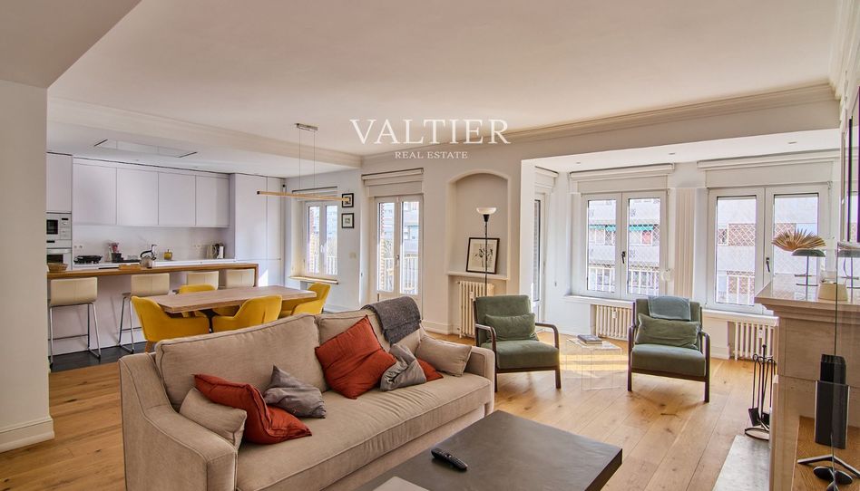 Espectacular vivienda situada en pleno corazón financiero de Madrid, en edificio clásico de los años 50 con molduras originales, techos altos y suelos de madera natural.