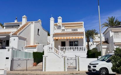 Descubre esta encantadora vivienda tipo “Carmen” situada en el exclusivo conjunto residencial “Rioja”, en la prestigiosa zona de Villamartín Golf, una de las áreas más valoradas de Orihuela-Costa.La propiedad, orientada al sur, destaca por su luminosidad y su excelente distribución. Cuenta con una superficie construida de 102,75 m² distribuidos en planta baja y buhardilla, ofreciendo espacios cómodos y versátiles.En la planta baja dispone de dos dormitorios y un baño completo, además de varias estancias funcionales y acceso mediante escalera interior a la planta superior. La buhardilla alberga un tercer dormitorio con baño en suite, ideal como zona privada, dormitorio principal o espacio independiente para invitados.En el exterior, la vivienda ofrece todo lo necesario para disfrutar del clima mediterráneo: una terraza, un amplio jardín privado de más de 140 m² y un fantástico solárium perfecto para relajarse o tomar el sol durante todo el año. Desde la vivienda se puede apreciar el Mar Mediterráneo en el horizonte, un valor añadido que aporta aún más encanto al entorno.La vivienda se vende completamente amueblada y equipada con electrodomésticos, lista para entrar a vivir. Además, dispone de calefacción central de gas y aire acondicionado en ambas plantas, garantizando el máximo confort en cualquier época del año. El residencial cuenta también con piscina comunitaria, ideal para disfrutar en familia.La ubicación es simplemente inmejorable: a menos de 5 minutos encontrarás todo tipo de servicios, como restaurantes, bares y supermercados. Para los amantes del golf, la zona ofrece hasta cuatro campos cercanos, incluyendo el reconocido Campo de Golf Villamartín. Y en menos de 10 minutos en coche podrás llegar a las hermosas playas de la Costa Blanca.Vivir en Villamartín significa disfrutar de sol, tranquilidad, servicios de calidad y un ambiente internacional durante todo el año. Muy cerca también se encuentra el popular centro comercial La Zenia Boulevard, con una amplia oferta de ocio, compras y restauración.Una oportunidad perfecta tanto como vivienda habitual, casa de vacaciones o inversión con alta rentabilidad.
