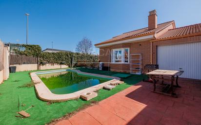 LA CASA AGENCY FUENLABRADA vende fantástico Chalet independiente situado en Meco, Madrid. La vivienda consta de 288 metros cuadrados, sobre una parcela de 499 metros cuadrados, distribuido en dos plantas de la siguiente manera: Planta baja: Hall de entrada, distribuidor con armario empotrado, 3 dormitorios con armarios empotrados, dos baños, salón-comedor independiente y amplia cocina con acceso a garaje. Planta primera: salón de ocio, un dormitorio y un baño. La parcela está equipada con patio delantero, piscina con bomba nueva, patio trasero y aparcamiento exterior. El chalet tiene excelentes calidades. Suelos de gres, ventanas de PVC con climalit, calefacción por Aerotermia con 100 litros de almacenaje, placas solares y Split de aire acondicionado en todos los dormitorios. Muy buena orientación, zona muy tranquila, residencial. Ubicación provista de comercios, colegios y centros deportivos, localidad en plena expansión de crecimiento. ¡Contáctanos hoy mismo para programar una visita y descubre todo lo que tiene para ofrecer! LA CASA.