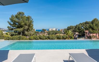 Modern 600 m² villa overlooking the bay of Puerto Portals! Exclusive new-build lifestyle villa set on a 1,270 m² plot in a quiet cul-de-sac. Enjoy breathtaking panoramic views of the open sea, Puerto Portals Bay, and the surrounding landscape. The villa spans three floors and features: - 5 bedrooms, 5 bathrooms (4 en suite) - Fully furnished and move-in ready - Air conditioning (hot/cold) - Underfloor heating - Alarm system - Built-in wardrobes - Utility room - Elevator - Garage for 2 cars Only 2 km from the beaches, 5 minutes by car to the luxury marina of Puerto Portals, and 20 minutes from the international airport. Perfect for stylish living in a prime Mallorca location.