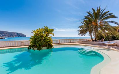 Villa primera línea al mar con acceso a la playa Villa de lujo única frente al mar en una ubicación fantástica. Esta villa de primera línea ha sido reformada al más alto nivel y tiene acceso directo a la playa. Todas las instalaciones de Moraira están a unos minutos a pie. Tiene amplios jardines tropicales mediterráneos con una piscina de 18 x 10 m de agua salada y climatizada, barbacoa y zonas de lounge para disfrutar de las vistas al mar. En la parcela de 1707 m2 hay una amplia zona de parking y garaje doble. Planta baja: -Amplio hall de entrada, aseo de invitados y generoso trastero, suelos de mármol. Amplio y luminoso salón/comedor con chimenea y vistas panorámicas al mar. -Bar equipado con 2 neveras bajo encimera y almacenamiento - Tres chimeneas de gas. - Amplia cocina de color negro equipada con: Electrodomésticos de alta gama que incluyen horno de vapor, horno de convección, microondas y cafetera totalmente automática, congelador y frigorífico( no frost), placa de cocción, amplio espacio de almacenamiento y zona de desayuno con vistas al mar. - Una impresionante oficina con espacio para 2 escritorios: - Dormitorio 1 principal muy amplio con baño en suite y vestidor con mucho almacenaje - Dormitorio 2: muy amplio con baño en suite con doble ducha acristalada - Lavadero equipado con lavadora, secadora, congelador, frigorífico y armarios empotrados - aseo Planta alta: -2 dormitorios más, ambos con vistas al mar. Ambos con armarios empotrados, cada uno con un cuarto de baño independiente con ducha, lavabo e inodoro -Cocina independiente con lavavajillas -Baño de invitados -Almacén -Acceso a la azotea muy grande con comedor, lámparas, pérgola, solarium separado para tumbonas y sistema de riego automático para las macetas. Césped artificial de la mejor calidad por todas partes, enchufe para TV, fuente de agua y una ducha exterior independiente. Planta sótano: -Gran zona de almacenamiento con 25 m de armarios empotrados - Gimnasio -Sauna de infrarrojos -Zona separada para tratamientos de belleza con una generosa ducha -Amplia sauna finlandesa. Se ha prestado especial atención al acabado de alta calidad con piedra natural como la piedra de mármol. Varios espacios equipados con calefacción/refrigeración por suelo radiante. Toda la casa funciona por climatización, Frío/Calor. 40 paneles solares en el techo, con almacenamiento de la batería.