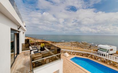 Exclusiva villa en primera línea de mar con espectaculares vistas panorámicas Descubra esta magnífica y luminosa villa situada en un enclave privilegiado frente al mar, que combina a la perfección amplitud, confort y diseño. Ubicada en una tranquila zona residencial con excelente infraestructura, la propiedad brinda un estilo de vida único junto al Mediterráneo. La vivienda ofrece 4 amplios dormitorios, 5 elegantes baños, dos salones y una cocina moderna totalmente equipada, pensada para disfrutar tanto en familia como con invitados. En el exterior, podrá relajarse en su piscina privada rodeada de un espacio soleado, aprovechar el estacionamiento propio y el trastero, y coronar la experiencia con un espectacular solárium en la azotea con jacuzzi, desde donde contemplar inolvidables puestas de sol sobre el mar. Su localización es inmejorable: a escasos pasos de restaurantes, tiendas, farmacias y de la playa de La Mata, lo que convierte esta villa en la opción perfecta para quienes buscan lujo, comodidad y una experiencia costera exclusiva. Características principales: Superficie construida: 210 m² Parcela: 342 m² 4 dormitorios 5 baños 2 salones Cocina totalmente equipada Solárium con jacuzzi Piscina privada Aparcamiento propio Sótano Nota legal: Tasas e impuestos no incluidos. La información proporcionada es orientativa y no vinculante jurídicamente, pudiendo contener errores.
