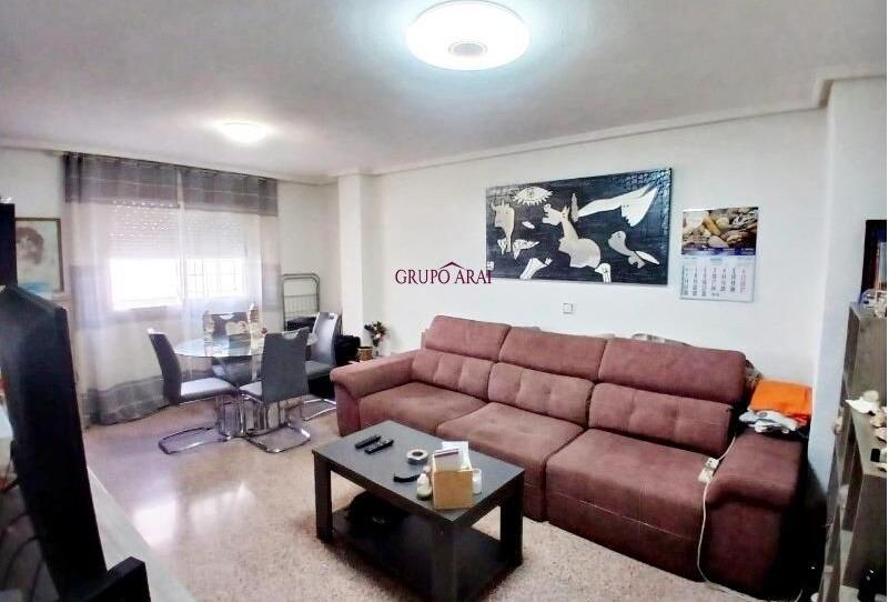 Al final del pasillo se abre un salón muy luminoso, con aire acondicionado, y junto a él el dormitorio principal, ambos orientados hacia la Avenida de Novelda, por lo que entra muchísima luz natural.