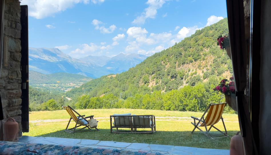 En la planta baja se encuentra un impresionante salón comedor con cocina americana, con gran ventanal-mirador de 6 m2 con unas vistas absolutamente espectaculares de Cotiella, La Sierra de Chia y la zona del Posets. Esta fabulosa estancia dispone de una preciosa chimenea de piedra.