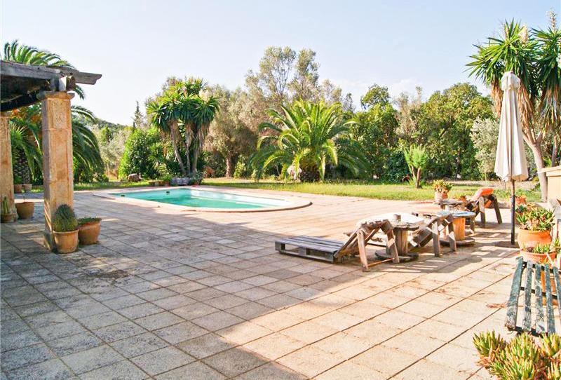 Finca rústica en solar de 28.000 m2 aprox. con piscina. Esta finca tiene una superficie de unos 160 m2 construidos en una planta, amplio salón comedor con chimenea, cocina amueblada y equipada con office, 3 dormitorios dobles con armarios empotrados, 3 baños, calefacción, terraza con porche, amplio jardín, parking cubierto para 3 vehículos, vistas despejadas. Más un terreno de 145.000m2. Finca en una sola planta. A unos 25 minutos de Palma. Cerca de preciosas playas.