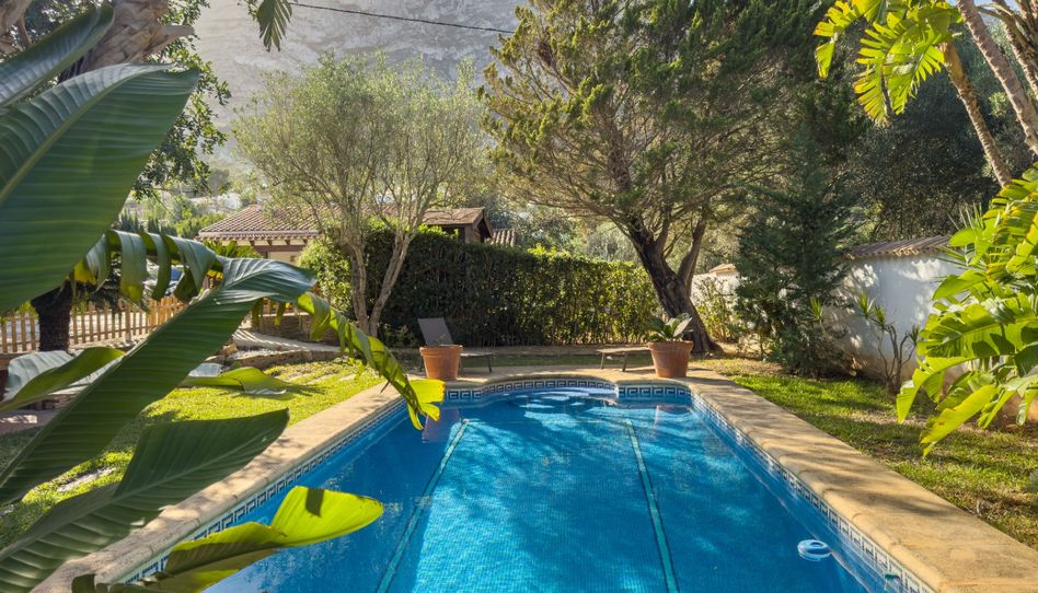 El exterior destaca especialmente: cuenta con una piscina privada rodeada de vegetación, un cuidado jardín con especies típicas de la zona, amplias áreas para relajarse tanto al sol como a la sombra y una gran explanada con capacidad para estacionar varios coches con facilidad.
