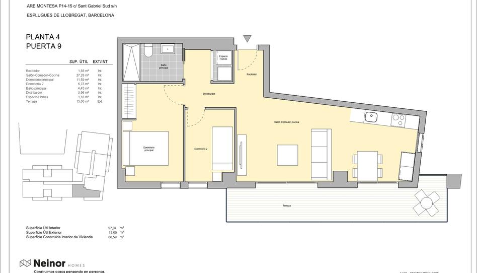 OBRAS INICIADAS. Nueva promoción de viviendas de 2, 3 y 4 dormitorios situada entre la Calle Sant Gabriel y la prolongación de La Rambla del Carme de Esplugues de Llobregat. Próxima parada línea 3 de metro. A 10 minutos de Barcelona. NO | BA Homes V es un conjunto residencial compuesto por 90 viviendas, 2 locales comerciales, 98 garajes para vehículos, 90 trasteros y 45 plazas de garaje para motocicletas. Las 90 viviendas cuentan con 2, 3 o 4 dormitorios, distribuidas en planta baja más 4 alturas y planta baja más 14 alturas, todas con acabados de alta calidad. Este conjunto residencial incluye una amplia zona Chill Out en la azotea de la planta 15, con magníficas vistas, un gimnasio exterior en la planta 5 para ejercitarse al aire libre y un taller de bicicletas en el garaje. Ubicado en el sector Montesa, Esplugues de Llobregat este proyecto se caracteriza por sus fachadas modernas y cálidas, construidas con materiales sostenibles que favorecen el ahorro energético y proporcionan bienestar y confort para toda la familia. El precio de la vivienda no incluye el parking ni el trastero.