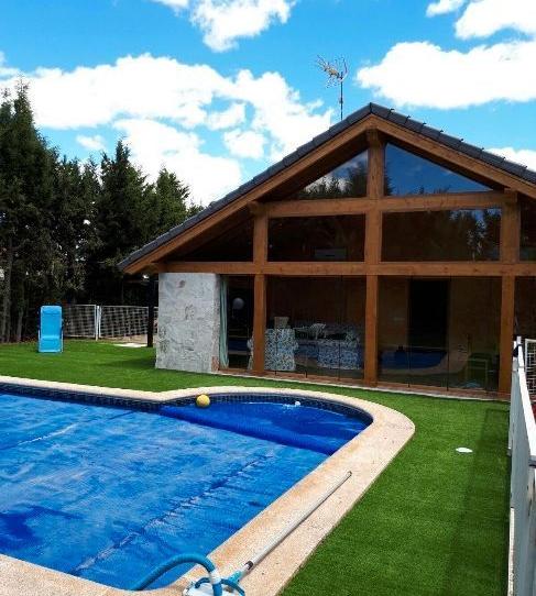 Huspy os presenta un impresionante chalet en la provincia de Guadalajara a 45 min de Madrid , ideal como segunda residencia La vivienda se destruye en una planta con 3 dormitorios y un baño , dos salones uno de ellos acristalado que se abre entero con salida a la piscina para disfrutar el verano , cocina grande con una isla y buhardilla con dos dormitorios aseo y zona de ocio o juego .