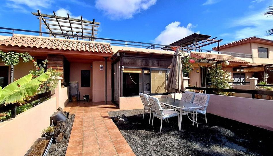 La propiedad está completamente amueblada y cuenta con un amplio jardín delantero con mesa y sillas, con la excelente ventaja de una ampliación de la habitación añadida desde el salón, que puede utilizarse como sala de verano o como zona de descanso adicional. Al entrar en la propiedad, hay un luminoso salón-comedor que incorpora una cocina abierta totalmente equipada, un cuarto de baño de buen tamaño con bañera y bidé, 1 dormitorio doble con armarios empotrados y puerta corredera que da acceso al precioso jardín trasero con vistas abiertas. El jardín también cuenta con una zona de cocina muy práctica, con una amplia encimera y fregadero, ideal para disfrutar de barbacoas con amigos y familiares. También hay un práctico trastero de aluminio que se puede utilizar para guardar bicicletas, tablas de surf o herramientas. Una escalera de caracol desde el jardín le lleva a un fabuloso solárium en la azotea, con impresionantes vistas al mar, a Lanzarote y a los volcanes de los alrededores.