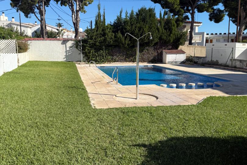 Chalet de 100 metros, junto paseo marítimo a 20 metros de la playa, muy céntrico, buena ubicación, todos los servicios cerca, parcela comunitaria de 1.000 metros, 3 habitaciones, 2 baños, salón comedor, cocina independiente, terraza, pequeño jardín privado, garaje independiente cerrado, piscina, jardín.