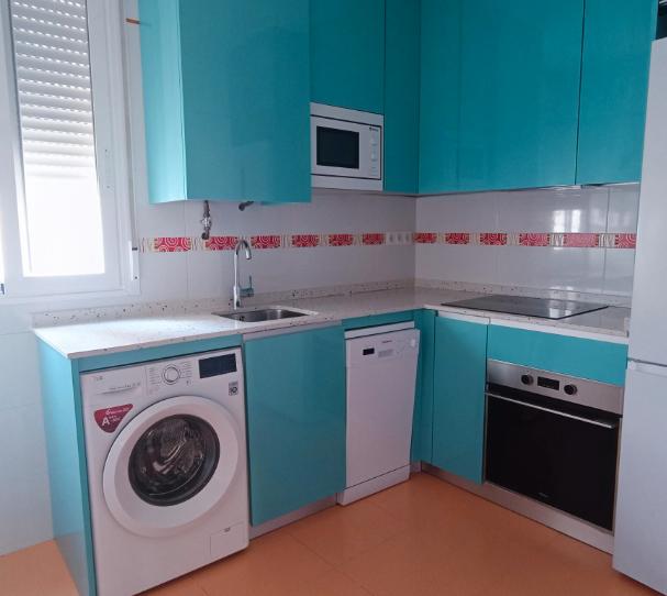 La cocina se entrega totalmente equipada con muebles altos y bajos y electrodomésticos.