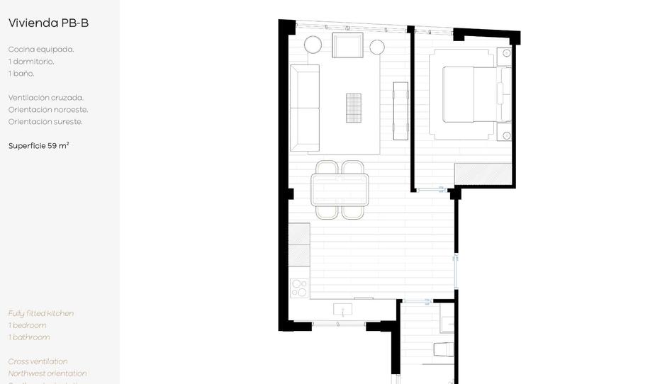 Entre2 Servicios Inmobiliarios presenta esta vivienda de 59 m2, ubicada en una finca con ascensor, diseñada con una distribución interior optimizada y doble orientación noroeste–sureste, manteniendo la coherencia estética y funcional del conjunto de la promoción.