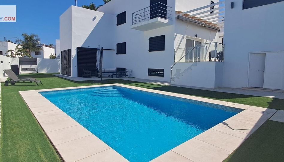 Además contiene una Bonita Piscina privada con césped artificial, palmeras, garaje privado cubierto para aparcar hasta 2 coches, etc...