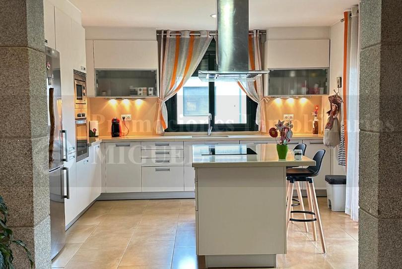 PLANTA BAJA: tres dormitorios y dos baños completos, destacando la suite principal con vestidor y baño. El corazón de la casa lo forman un amplio salón con chimenea y la cocina, conectados mediante un arco de piedra en un concepto abierto que aporta luminosidad y continuidad visual. La entrada principal está presidida por una bonita terraza con vistas despejadas.