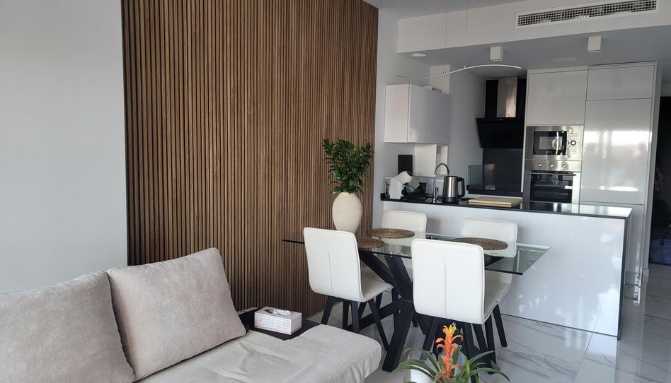 El salón, de diseño abierto, conecta la cocina, con muebles blancos y negros, y la sala de estar con el balcón privado. Las puertas corredizas de cristal permiten la entrada de luz natural. La cocina está bien equipada con utensilios y electrodomésticos, como microondas, placa eléctrica, horno, lavavajillas, etc. El dormitorio principal dispone de baño en suite con ducha y calefacción por suelo radiante. Los dormitorios cuentan con armarios empotrados. Ambos dormitorios son amplios y luminosos. El baño familiar también cuenta con ducha a ras de suelo y calefacción por suelo radiante. Hay aire acondicionado frío/calor por ventilación