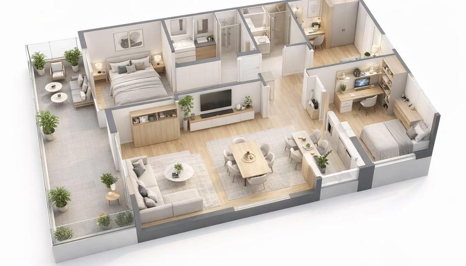 Pisos de 3 habitaciones, 2 baños completos con plato de ducha, y amplias terrazas, con terrazas donde disfrutar del aire libre.