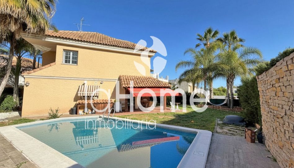 El exterior disfruta de un fantástico jardín con césped natural, palmeras y piscina privada, además de una agradable terraza con porche de madera y toldos eléctricos, perfecta para disfrutar en cualquier época del año.