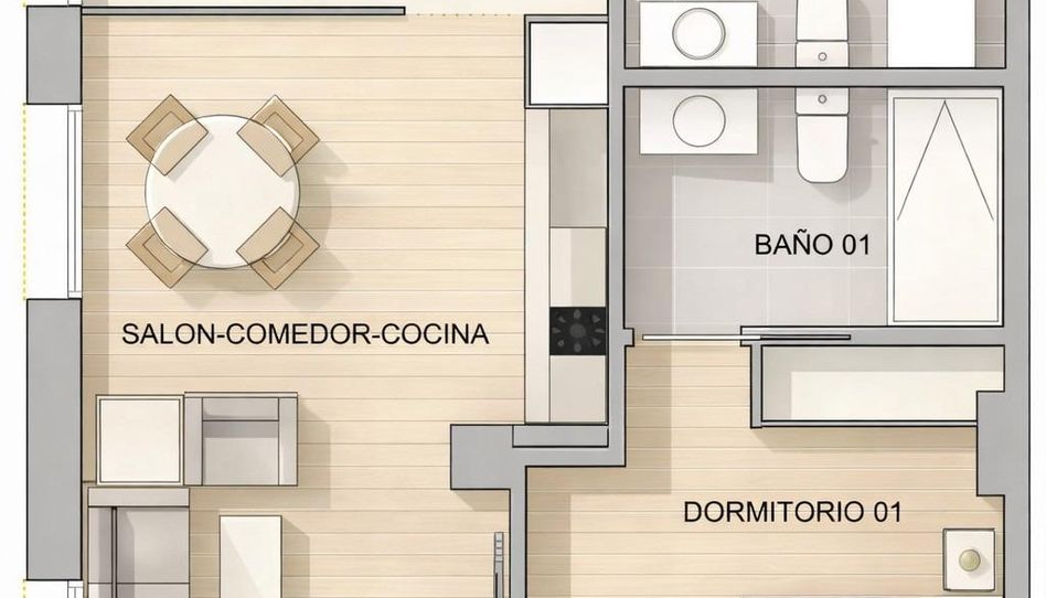 Vivienda de unos 60m2, distribuida en zona central con salón comedor y cocina, amplio Dormitorio, baño completo y aseo con lavadero. un segundo dormitorio, abierto ideal como zona de trabajo o de dormitorio invitados. Disponemos de dos viviendas, en construcción, cómodas y a un paso de todos los servicios necesarios.