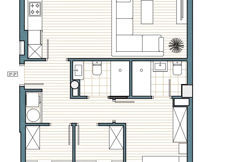 la distribucion de la vivienda es de cocina americana de 27m2 mas recibidor de 6m2 y mas tres dormitorios de 12, 7 y 7 m2 cada una de ellas, la mas grande con suite y con dos baños completos en total.