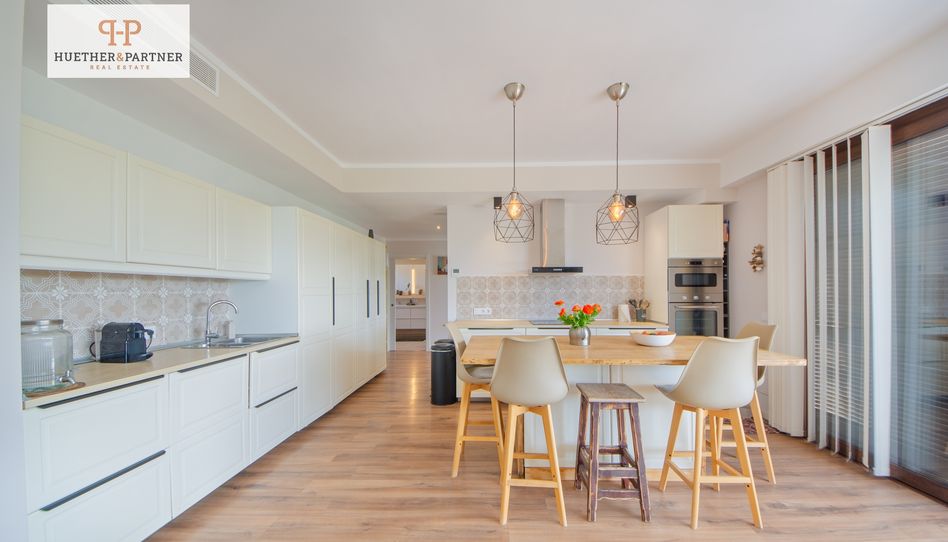 En la planta superior hay otro dormitorio doble, un dormitorio individual, un cuarto de baño y un amplio salón-comedor de planta abierta con cocina integrada. Esta planta también tiene una gran terraza con preparación para una bañera de hidromasaje. Debido a la distribución de las habitaciones, la planta superior puede utilizarse como vivienda independiente. Un sistema central de aire acondicionado garantiza un confort moderno en todas las habitaciones.