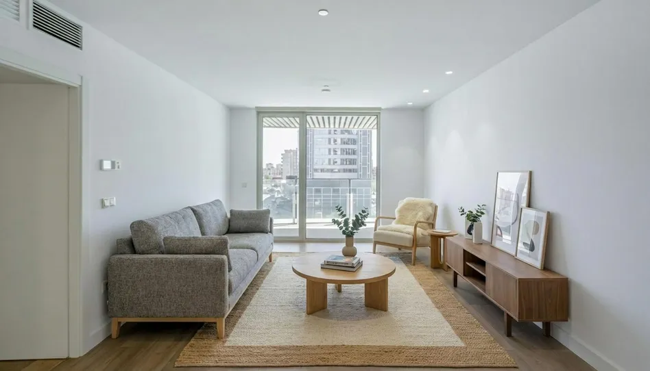 La vivienda de 110m2 ofrece un diseño funcional y elegante, con espacios llenos de luz y acabados de alta gama. El salón-comedor, amplio y luminoso, conecta directamente con una terraza que invita a disfrutar del clima valenciano. La cocina de concepto abierto, con isla central, combina estilo y funcionalidad: encimeras de Silestone, acabados laminados y electrodomésticos integrados de alta gama (horno, frigorífico, lavavajillas, placa de inducción y campana extractora).
