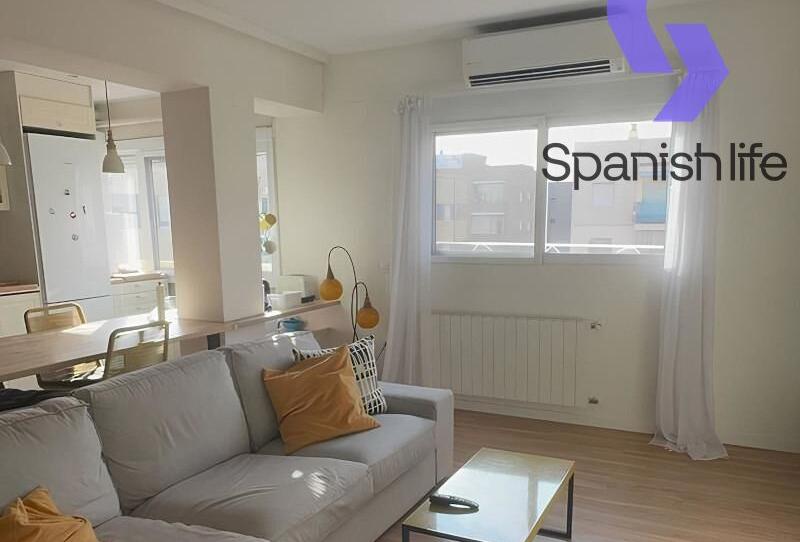 Dispone de dos dormitorios exteriores, dos baños amplios (uno de ellos en suite dentro del dormitorio principal). La cocina está integrada con el salón-comedor, formando un espacio abierto, luminoso y funcional, con un diseño moderno y electrodomésticos actuales. Como valor añadido, el piso cuenta con aire acondicionado de última generación, calefacción por gas y acceso a una terraza comunitaria en la azotea con agradables vistas a la ciudad.