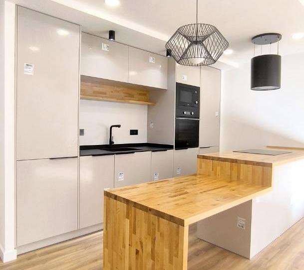 Y un fantastico Living compuesto de cocina con una gran isla con mesa de 4 comensales mas zona de barra para tres taburetes, abierto a un gran y luminoso salón comedor que da a un largo balcón esterior.