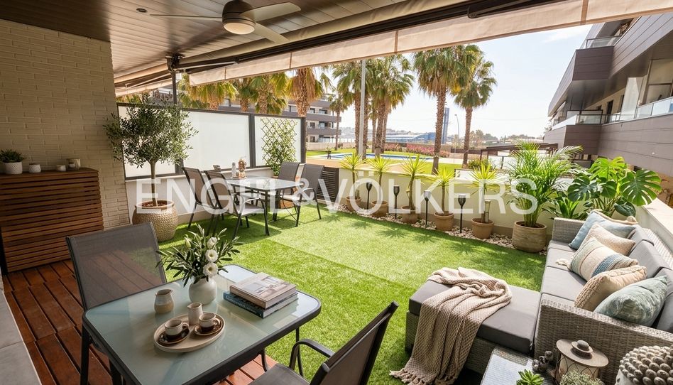 Todo ello con agradables vistas a la cuidada zona comunitaria con piscina y con el mar como telón de fondo, a escasos minutos del paseo marítimo, creando un entorno único donde interior y exterior se integran a la perfección.