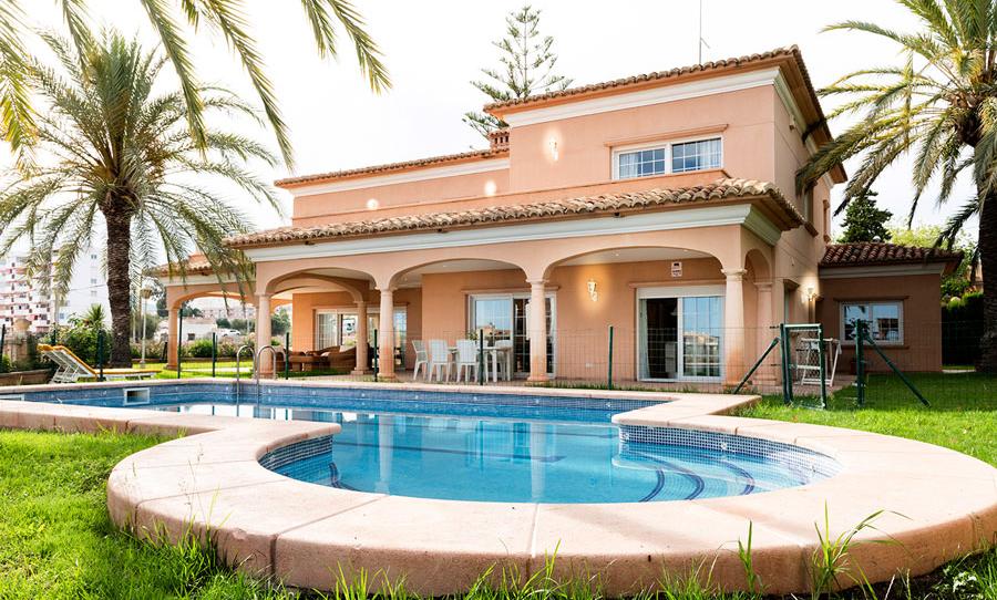 VILLA DE LUJO magnífico chalet independiente de 485 m² construidos en tres plantas. Inmejorable situación, a tan sólo 1 minuto caminando a la playa y a 3 minutos del puerto. Se ubica en una parcela llana de 915 m². La planta baja tiene una superficie construida de 177 m ² y consta de hall, salón-comedor, cocina, aseo de cortesía, cuarto de lavandería y habitación de servicio con baño. Se tiene acceso desde esta planta a un porche de 9,60 m² y a una zona de pérgola de 99 m². La primera planta tiene de 153 m² construidos y constan de cuatro dormitorios con baño incluido y terrazas con vistas al mar, el principal tipo suite con bañera de hidromasaje y ducha, más una habitación con sauna y ducha. El garaje, en planta sótano, tiene una superficie construida de 154 m² con cabida para 6 coches. Estupendas vistas al mar y a la zona de la playa. Excelentes calidades de construcción, con puertas lacadas en blanco, todos los armarios vestidos, puertas correderas y abatibles con persianas automáticas. Climatización mediante aire acondicionado frío/calor y caldera de gasoil para la calefacción mediante radiadores. Suelo de mármol blanco en todas las estancias excepto garaje y cocina.
