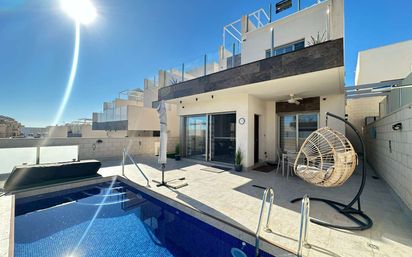 B-3492. Stunning contemporary villa located in the exclusive “Pink Paradise” area of PAU 26, Villamartin, offering stylish Mediterranean living with exceptional panoramic views. This beautifully designed home features a bright open-plan living and dining area with a sleek modern kitchen, creating a light-filled and elegant space. The ground floor includes a versatile room, currently used as an office, with convenient Jack and Jill access. Upstairs, the master suite boasts an en-suite bathroom and a spacious terrace with views of the salt lake, while a second double bedroom also benefits from its own en-suite. Outside, the property offers a private swimming pool and allocated parking on a private road directly in front of the villa, combining comfort with convenience. The highlight of the home is the impressive rooftop solarium with summer kitchen, offering breathtaking views of the pink salt lake, the Mediterranean Sea, and surrounding mountains—perfect for outdoor living and entertaining. An ideal low-maintenance luxury home, perfect as a holiday retreat, permanent residence, or investment in one of Villamartin’s most desirable locations.