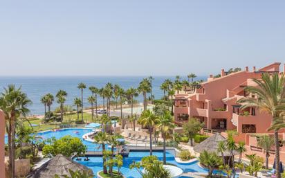 ¡Apartamento de lujo de 4 dormitorios en el complejo frente al mar con vistas al mar! Amplio salón con comedor, 4 dormitorios/4 baños, gran terraza cubierta y enorme jardín privado con salida a la piscina comunitaria. El apartamento está equipado con suelos de mármol, aire acondicionado frío/calor, armarios empotrados, calefacción por suelo radiante y sistema de alarma. El complejo está totalmente cerrado con seguridad las 24 horas, gran piscina de verano, piscina cubierta climatizada, gimnasio y sauna. Tiene una ubicación ideal con acceso directo al mar y un increíble paseo marítimo, a poca distancia de Estepona y en 15 minutos en coche de Puerto Banús. Se vende apartamento con 2 plazas de aparcamiento y 2 trasteros. Si buscas comodidad, seguridad y lujo ¡deberías verlo!