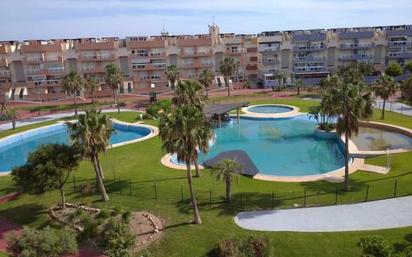 Ático con solárium en el residencial Laguna Beach en Almerimar. Ático esquinero muy luminoso con orientación sur, de 3 dormitorios, 2 baños uno de ellos en suite, salón, cocina independiente con pasa platos y terraza . El solárium tiene una superficie de 70 metros con barbacoa, donde poder disfrutar de largas veladas con amigos o familia. El ático desde su terraza y solárium tiene unas bonitas a las zonas comunes. La vivienda tiene una plaza de garaje y un trastero incluidos en el precio. Muy luminosa ya que hace esquina. El residencial consta con varias piscinas dos de ellas infantiles, pistas de pádel, pista de tenis, gimnasio con jacuzzi, varios parques infantiles y un amplio chiringuito privado dentro del residencial. Amplias zonas de jardín y esparcimiento. Este residencial se encuentra a 200 metros de la playa y del paseo marítimo.
