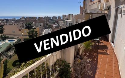 Luminoso y acogedor ático con vistas al mar en residencial con jardín y piscina. La vivienda cuenta con salón comedor, cocina amueblada y equipada, tres dormitorios (uno de ellos convertido en vestidor y pequeño estudio), baño completo con ducha exterior y dos terrazas (una de ellas con acceso desde el salón y el dormitorio principal con vistas al mar y a la zona comunitaria y la otra con acceso desde la cocina y otro de los dormitorios, de aproximadamente 30 m2 techada completamente con parte del techo corredero y el frontal con cortinas de cristal abatibles y estores). Solería en gres porcelánico, aire acondicionado por consolas en dormitorio principal y salón. Edificio con ascensor. Zona de aparcamiento junto al edificio. Zona tranquila ideal para vivir todo el año, colegios y servicios en la zona y con buena conexión a la autovía. No dude en visitarlo! [IW]