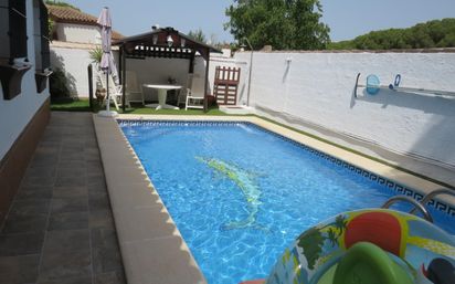 Les ofrecemos un estupendo chalet en Pago de Humo en la zona de Canteruelas, a menos de diez minutos en coche al pueblo y a menos de veinte minutos a la playa de la Barrosa. Enclavado en parcela de unos 500m2 en régimen de división horizontal, 110m2 construidos. Está para entrar a vivir, en buenas calidades. Se distribuye de la siguiente manera: Porche de entrada. Nos encontramos con un pasillo, desde se distribuyen todas las estancias, a la izquierda cocina, con puerta trasera. A la derecha, gran salón con chimenea. A la izquierda cuarto de baño con placa de ducha. Le sigue dormitorio individual y otro a la derecha y finalmente el dormitorio principal con armario empotrado y cuarto de baño "in suite". En el exterior nos encontramos con una gran piscina de 7x4m. Cuarto trastero. Zona de barbacoa. No lo duden y vengan a visitarlo!! En cumplimiento del Decreto de la Junta de Andalucía 218/2005 del 11 de Octubre, se informa al cliente que los gastos notariales, registrales, impuestos, honorarios de la agencia ( 3% + IVA ) y otros gastos inherentes a la compraventa no están incluidos en el precio
