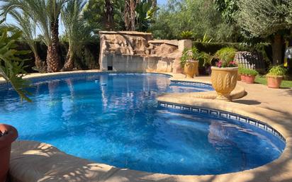 Se vende bonito chalet de estilo rústico en Elche, zona Alzabares Bajo. La propiedad se encuentra en una parcela de 2000 m2 de superficie. La vivienda consta de 490 m2 de superficie habitables, los cuales se distribuyen de la siguiente manera: - 7 habitaciones dobles - 2 baños interiores - 1 baño exterior - 2 cocinas. Una amplia cocina independiente de 30 m2, una segunda cocina americana de 12 m2 - 2 salones. Un amplio salón de 60 m2 de superficie, con chimenea, y techos de 6 metros de alto, un segundo salón de 35 m2, con chimenea. - Amplio porche acristalado con vistas al jardín y a la piscina - Terraza en segunda planta de 20 m2 - Barbacoa techada - Piscina privada con cascada de piedra natural y jacuzzi - Parking cubierto para 3 coches - Zona para animales - Riego por goteo La vivienda cuenta con agua potable, agua de riego y 32 placas solares que abastecen a toda la vivienda de energía eléctrica. La propiedad se encuentra en perfecto estado de conservación, ubicada en un entorno ideal, próximo al Hospital General de Elche, a tan sólo 2 minutos del supermercado Lidl de Avenida de Dolores. Vivienda muy amplia y acogedora, ideal para dos familias. Extras: agua, aire acondicionado, alarma, barbacoa, buhardilla, chimenea, deposito agua, jardín, luz, piscina propia, puerta automática, riego automático, solárium, t.v., techos altos, terraza, terraza acristalada, trastero, árboles, hospitales, supermercados, vallado.