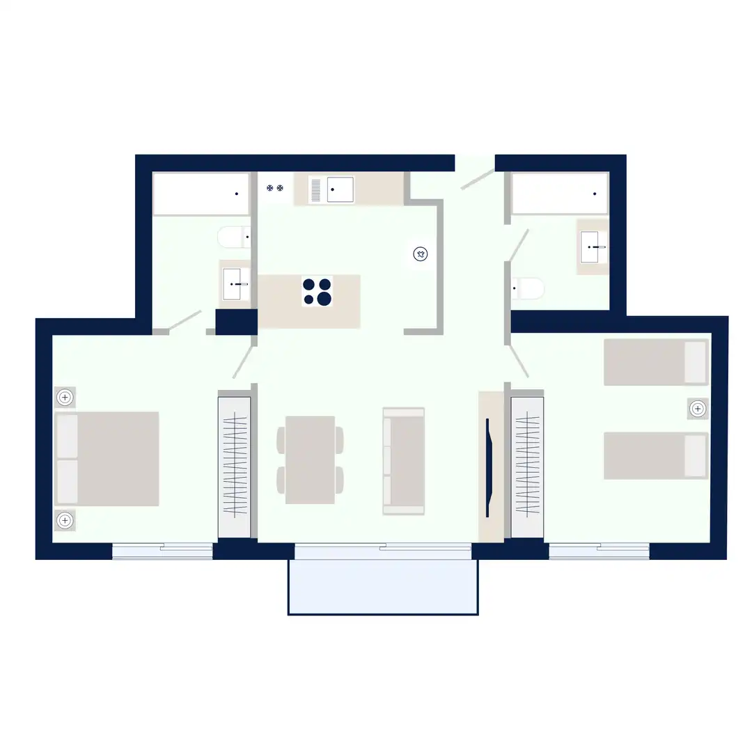 Vivienda de dos dormitorios amplios que destacan por su comodidad y proporciones equilibradas. La cocina americana se integra con la zona de estar, generando un espacio práctico y funcional que favorece la convivencia diaria. Su diseño moderno prioriza el confort, la organización y el aprovechamiento de cada metro cuadrado, creando un ambiente acogedor y bien resuelto. Una tipología ideal para quienes valoran la amplitud en las estancias principales y buscan un hogar con distribución sencilla, materiales de calidad y sensación de bienestar desde el primer momento.