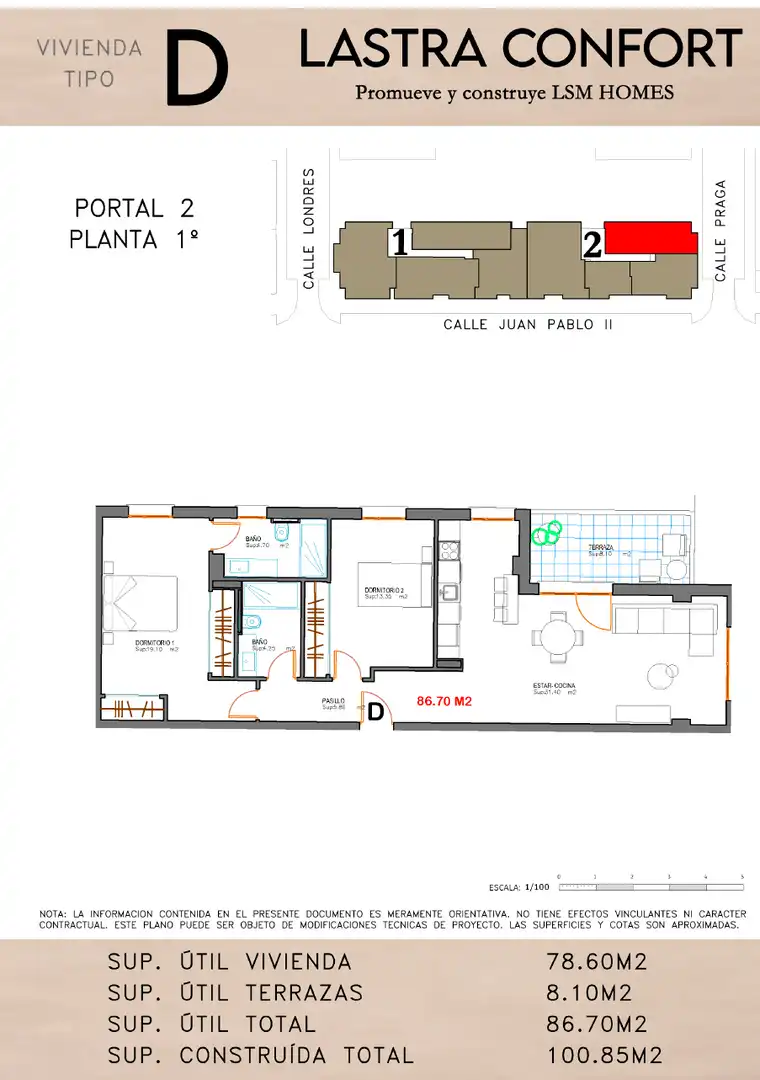 Este moderno proyecto con excelentes calidades, consta de 29 viviendas, garajes y trasteros. Todo ello distribuido en 2 portales con acceso principal desde la Calle Juan Pablo II. Excelente orientación y ubicación junto al nuevo Centro Comercial de La Lastra.