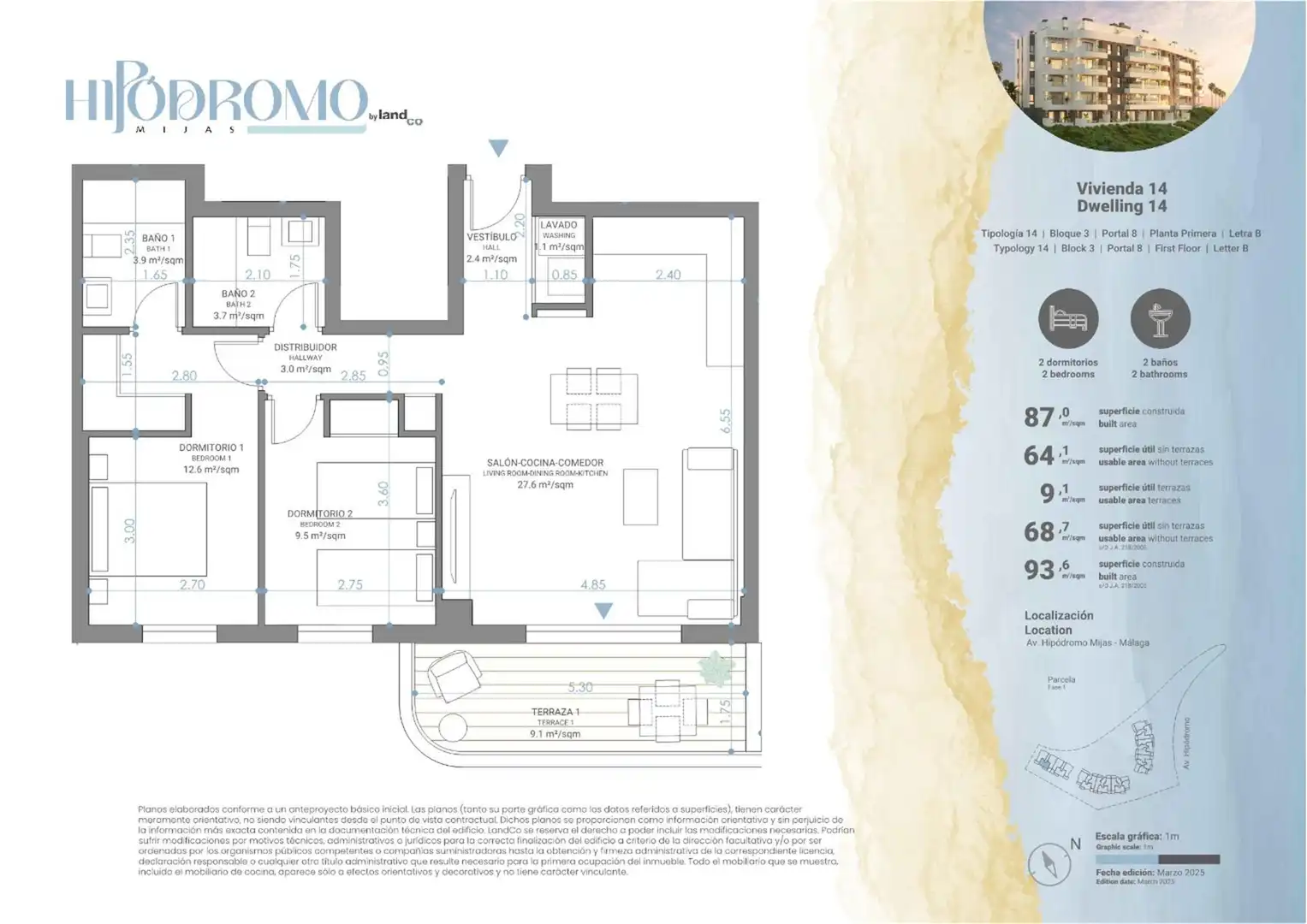 Descubre Hipódromo Mijas by landCo, una exclusiva promoción de 117 viviendas de 1, 2 y 3 dormitorios, diseñadas con alta calidad en materiales y acabados. Disfruta de luminosas terrazas y espectaculares áticos con terrazas de más de 125 m² y vistas al horizonte mediterráneo. Todas las viviendas disponen de garaje y trastero para mayor comodidad.
