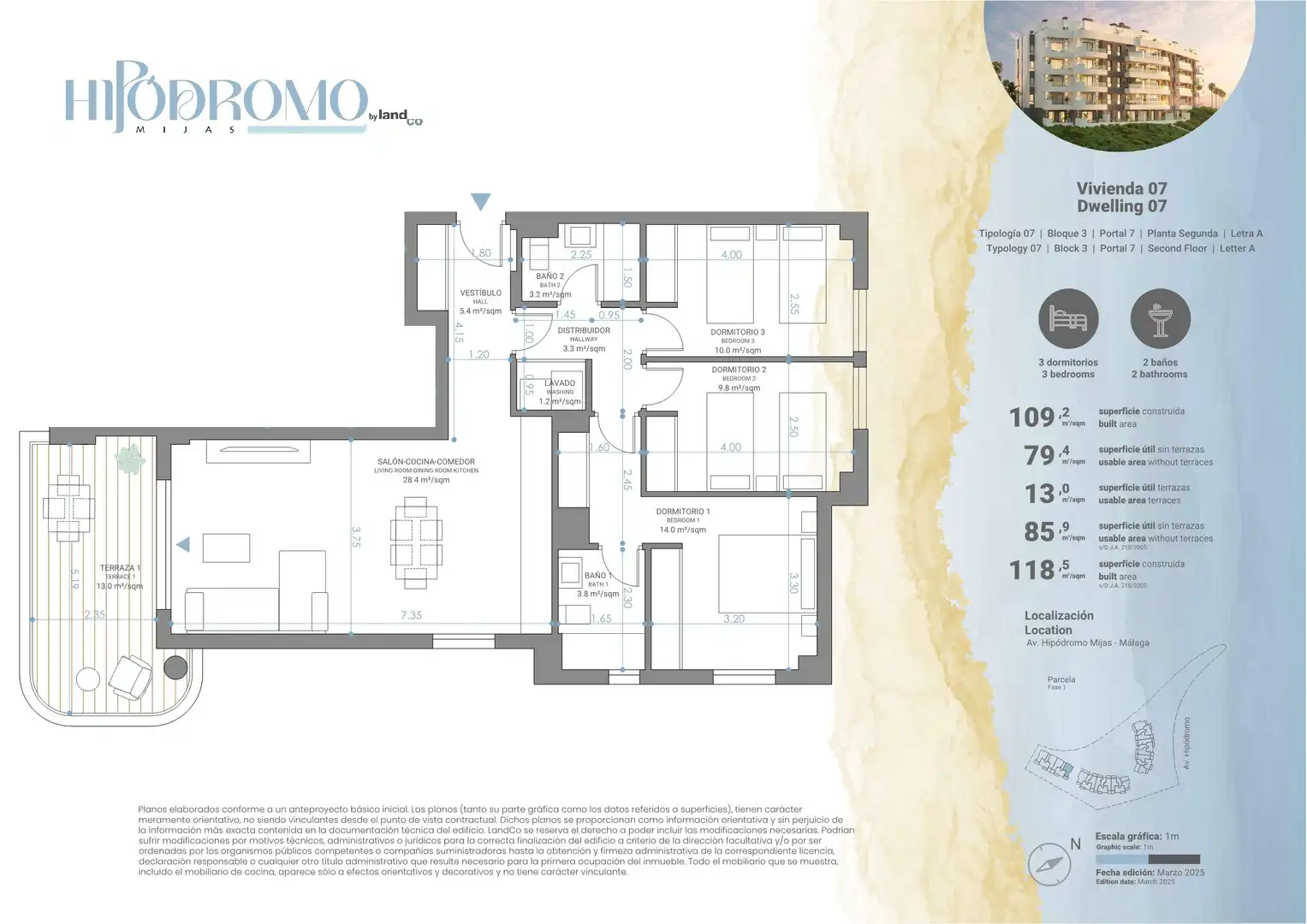 Descubre Hipódromo Mijas by landCo, una exclusiva promoción de 117 viviendas de 1, 2 y 3 dormitorios, diseñadas con alta calidad en materiales y acabados. Disfruta de luminosas terrazas y espectaculares áticos con terrazas de más de 125 m² y vistas al horizonte mediterráneo. Todas las viviendas disponen de garaje y trastero para mayor comodidad.