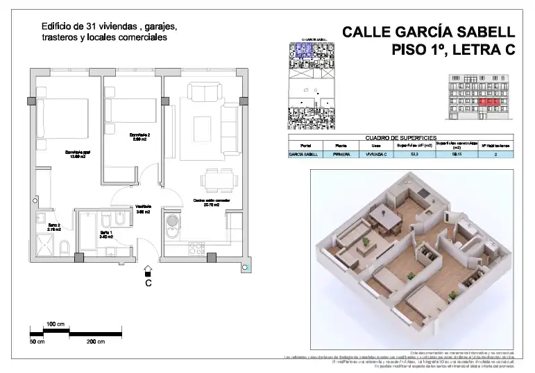 Vivienda en1ª planta con salón-comedor, cocina totalmente equipada, 2 dormitorios con armarios empotrados y 2 baños. El precio incluye plaza de garaje y trastero.