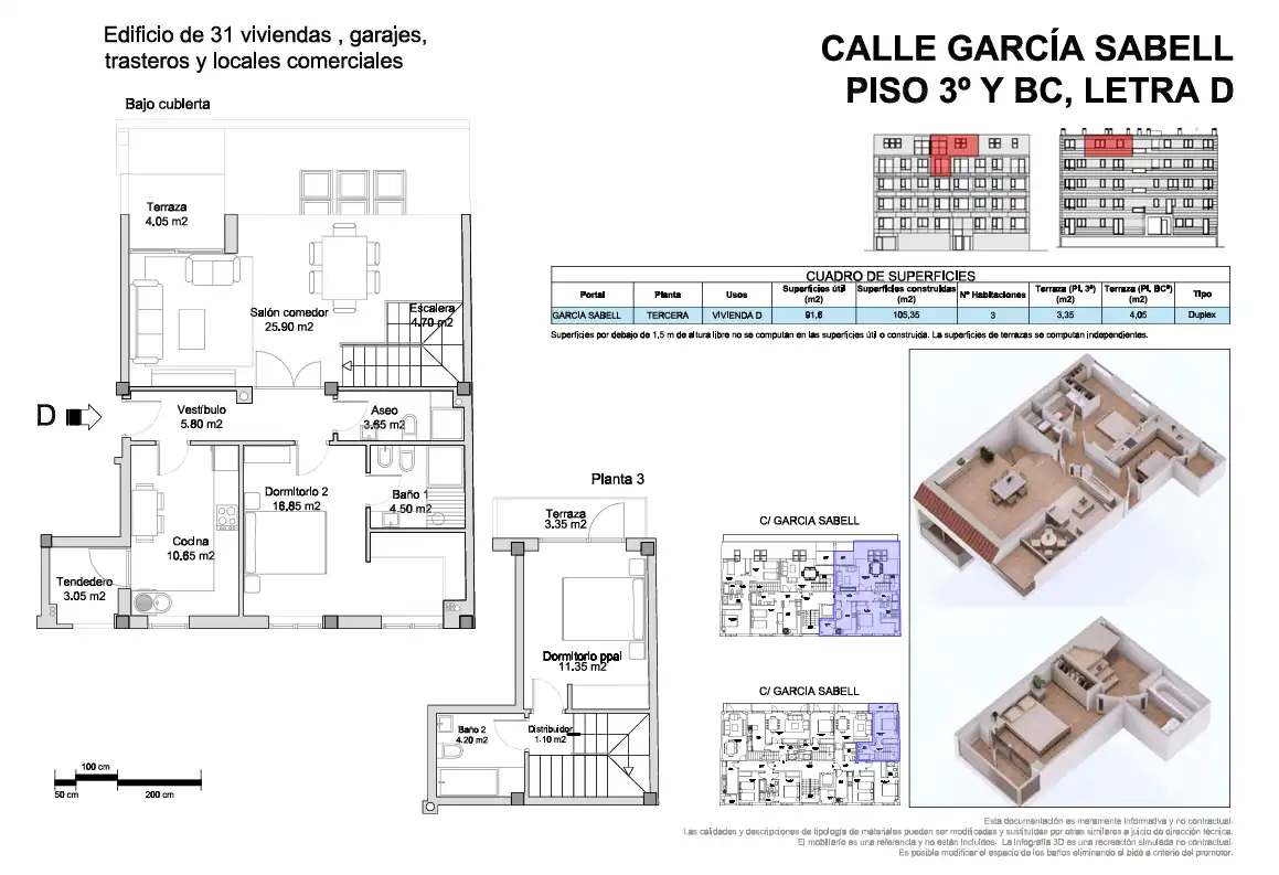 Vivienda tipo dúplex de 105 metros distribuidos en salón-comedor, cocina totalmente equipada con tendedero, 2 dormitorios con armarios empotrados y 2 baños. Además, cuenta con dos terrazas, una de 4 metros y otra de 3,3 metros. El precio incluye plaza de garaje y trastero