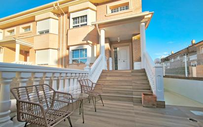 Esta vivienda pareada completamente reformada destaca por su amplitud y equipamiento completo, ideal para familias. � Distribución por Plantas. Planta Principal: Salón-comedor luminoso con escalera abierta muy luminosa, aseo de cortesía y cocina amplia con dos habientes. Desde la cocina se sale a una terraza de 70m² con paellero y pila terraza. Desde esta terraza se accede una zona verde comunitaria privada. Primera Planta: Habitación principal tipo suite (con baño privado y dos armarios), más dos habitaciones dobles con armarios empotrados que comparten un segundo baño con ducha. Una de las habitaciones disfruta de un balcón con vistas al jardín comunitario. Buhardilla: Espacio de 31m² con terraza techada y dos trasteros laterales. Sótano: Garaje de 77m² con ventilación natural al tener dos ventanas, trastero aprovechando el hueco de la escalera y una zona social con barra y fregadero. Chimenea de hierro forjado en el sótano � Exteriores y Ocio Piscina privada con agua salada: Con una longitud de 14 metros de largo, ideal para nadar y una zona de playita. Cuarto de máquinas de la piscina debajo escalera de la entrada. Zonas Verdes: Acceso directo desde la vivienda a un gran jardín comunitario seguro para niños. ⚡ Eficiencia, confort y acabados. Energía: Instalación de placas solares para el suministro eléctrico. Climatización: Calefacción central por radiadores (gas ciudad) y aire acondicionado mediante Split en toda la casa. Paredes del comedor y escalera de pan de plata. Paredes de estuco blanco cocina, estuco pared habitación. Baño principal de Porcelanosa con bañera jacuzzi y aseo planta baja Porcelanosa. Jardineras de mampostería. Ducha exterior. Paredes perimetrales terraza interior y exterior alicatadas. Preciosos árboles: olivo, roble y ciprés (signo de bienvenida y hospitalidad). Escalera de forja.