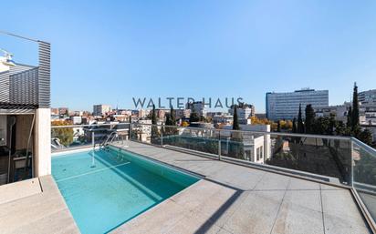 Presentamos un magnífico dúplex exterior situado en una tercera planta con ascensor, dentro de un edificio construido en 1999 con acceso adaptado. Esta finca destaca especialmente por llevar la firma del prestigioso y reconocido estudio Bueso-Inchausti & Rein Arquitectos, sinónimo de excelencia y diseño arquitectónico en la capital. La vivienda dispone de 236 m² construidos, distribuidos inteligentemente en tres niveles para maximizar la funcionalidad y la entrada de luz natural. Al acceder, nos recibe un amplio espacio de día que integra un salón luminoso y una cocina de concepto abierto, conectados directamente a una terraza con orientación sureste. La propiedad consta de 4 habitaciones y 4 baños, ofreciendo una separación clara entre las áreas sociales y privadas. El nivel superior define el carácter único del inmueble gracias a su impresionante azotea con piscina privada y solárium. Desde esta altura, la propiedad ofrece un espectáculo visual inigualable: unas vistas panorámicas de 360 grados a todo el Skyline de Madrid, disfrutando de las cuatro orientaciones (Norte, Sur, Este y Oeste), lo que garantiza una luminosidad y unas perspectivas excepcionales en cualquier momento del día. La zona de noche, ubicada en la planta inferior, incluye una suite principal con vestidor y jacuzzi, dos dormitorios dobles y un cuarto adicional en suite, ideal para servicio o despacho. Los acabados son de alta gama, con suelos de madera noble, mármol en los baños y cocina con electrodomésticos premium. Cuenta con aerotermia, suelo radiante, persianas motorizadas, trastero y garaje con capacidad para cuatro vehículos y carga eléctrica. La ubicación en El Viso garantiza un entorno residencial sereno y seguro, caracterizado por sus avenidas arboladas y ambiente diplomático. Su posición es estratégica, brindando acceso inmediato al eje financiero del Paseo de la Castellana y al Estadio Santiago Bernabéu. El barrio dispone de una oferta consolidada de colegios de alto nivel, restaurantes selectos y conexiones rápidas a la M-30, permitiendo disfrutar de una vida sofisticada sin renunciar a la conectividad con el resto de la ciudad. Adquirir esta propiedad significa asegurar un estilo de vida que combina privacidad, eficiencia energética y espacios al aire libre únicos en la capital. La presencia de vigilancia y conserje en la finca añade un valor extra de tranquilidad y comodidad a su día a día. Es una oportunidad ideal para quienes buscan amplitud y calidad en una ubicación inmejorable. En Walter Haus estamos a su disposición para ampliar información o coordinar una visita a este precioso hogar.