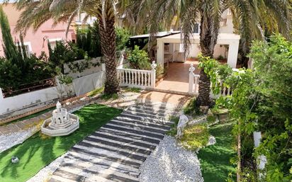 Encantador chalet con jardín – ¡Listo para entrar a vivir! Se vende chalet independiente, ideal para familias o como segunda residencia de verano, ubicado en una zona tranquila y soleada. La vivienda rodeada de jardín con palmeras, fuentes decorativas y estatuas que aportan un aire clásico y relajante. La casa cuenta con un amplio salón-comedor de concepto abierto, muy luminoso, con acceso directo a una cocina completamente equipada con muebles altos de gran capacidad y electrodomésticos integrados. Destacan los acabados en tonos blancos y encimeras de granito que aportan estilo y funcionalidad. Dispone de tres dormitorios dobles, todos con ventiladores de techo y decoración en papel pintado que añade un toque personal y acogedor. El dormitorio principal incluye baño en suite con ducha. Además, hay un segundo baño completo con bañera y un tercer baño con ducha, lo que proporciona comodidad extra para familias o visitas. El exterior es uno de los grandes atractivos de esta propiedad: terraza cubierta para disfrutar todo el año, zona de barbacoa, y un jardín de bajo mantenimiento con césped artificial, grava decorativa y elementos ornamentales. Perfecto para reuniones familiares, relajación o simplemente disfrutar del buen clima. Jardín delantero con vegetación natural que se puede disfrutar desde el porche cubierto de acceso a la vivienda. En la cubierta, el chalet cuenta además con una terraza solárium privada con dos espacios cerrados, perfecta como zona de almacenamiento, taller o incluso para habilitar como espacio adicional de ocio o trabajo. Características destacadas: 3 dormitorios y 3 baños Aire acondicionado en dormitorio principal, ventiladores en todas las estancias. Terraza solárium en la cubierta con dos espacios cerrados. Cocina totalmente equipada Parcela ajardinada con fuente y esculturas Jardín trasero con cenador de obra y barbacoa completamente equipada. Jardín delante con porche y césped natural. Zona residencial tranquila y muy cerc