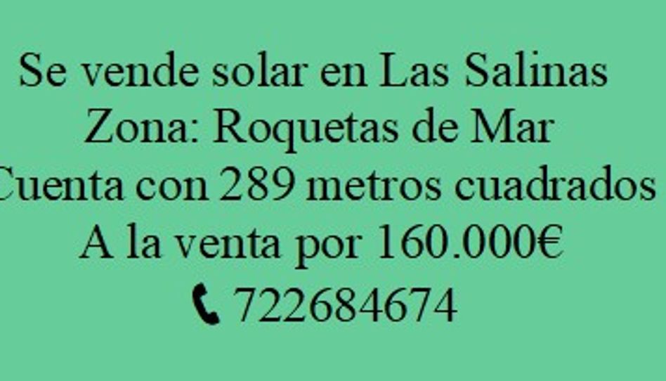 Excelente oportunidad de inversión en una de las zonas más demandadas de Roquetas de Mar. Este solar, ubicado en la zona de Las Salinas, cuenta con una superficie de 289 m², ideal para construir la vivienda de tus sueños o desarrollar un proyecto inmobiliario.