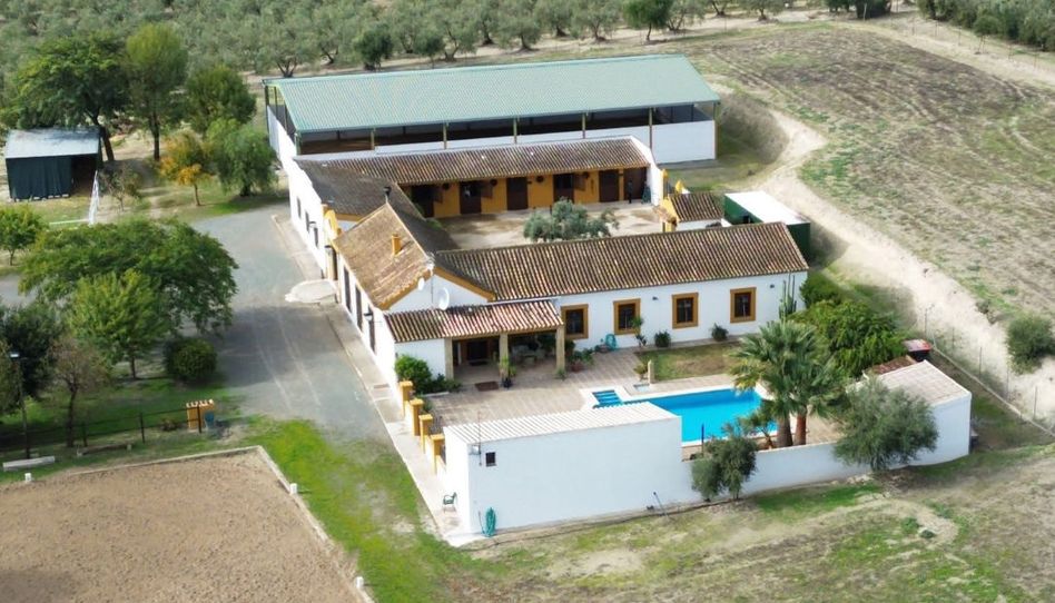 Dispone de un cortijo de 3 dormitorios con patio de cuadras, bar, casita y piscina, además de pistas de entrenamiento (una cubierta y otra al aire libre), ubicado en una parcela llana rodeada de campos de girasoles.