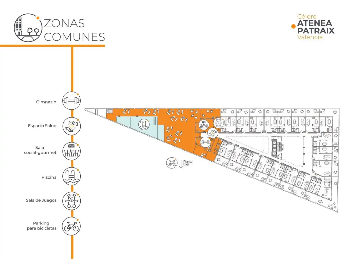 La promoción de obra nueva Célere Atenea Patraix es un conjunto residencial privado compuesto por 173 viviendas actualmente disponibles de 2,3 y 4 dormitorios todas con terraza; 23 despachos en planta primera y 19 despachos profesionales en segunda planta, también con terraza, garajes para coche y moto y trasteros.