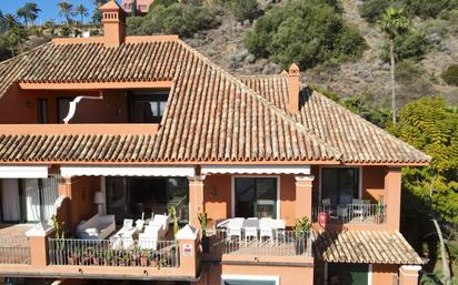 Complejo residencial con tan solo 36 vecinos, muy privado y tranquilo. La urbanización Monte Halcones está ubicada en la subida de San Pedro de Alcántara hacia Ronda, rodeado de zonas verdes, campos de golf y urbanizaciones de lujo. También tiene acceso directo a la Quinta para llegar a Nueva Andalucía. En la urbanización hay un centro comercial con todo lo necesario para la vida diaria. El completo tiene piscina comunitaria, seguridad y los garajes en la parte inferior de cada bloque. El ático dúplex está orientado sureste, con unas vistas abiertas y panorámicas al mar y campos de golf. El ascensor le llevara desde sus 2 plazas de garajes (situadas justo en frente a la puerta) hasta la entrada de la propiedad. Al entrar por la puerta apreciamos un amplio recibidor, a la izquierda tenemos una habitación que actualmente se ha convertido en un despacho pero que puede ser un dormitorio ya que tiene sus armarios. Pasado el recibidor, nos sorprende el amplio salón con las vistas al mar, dividido en 3 zonas: el comedor, el salón con chimenea y una parte con librería y su butaca tumbarse para leer. También en el salón hay una pequeña estancia como almacén, un baño completo y un leñero debajo de la escalera. La cocina es muy amplia con muchos muebles de almacenamiento y una isla en el medio para poder elaborar todas las comidas que quiera. Frente al salón tenemos una amplia terraza dividido en dos estancias, con gran parte de ella cubierta y otra parte abierta. En el lateral del salón tenemos un gran dormitorio con su baño en suite y su terraza privada. En la parte superior tenemos el dormitorio principal con su baño en suite, vestidor para él y para ella, y una gran terraza con unas vistas al mar impresionantes donde podrá disfrutar del jacuzzi con una buena copa de vino. La propiedad tiene 2 plazas de garaje (29m2) y un trastero (11m2). Aire acondicionado Daikin, suelo radiante en baños, carpintería interior de madera exótica africana de Zebrano, chimenea, jacuzzi, ventanas de doble acristalamiento, alarma, toldos en la terraza, cocina con electrodomésticos de altas prestaciones, cocina con isla, piscina comunitaria.