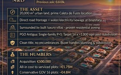 OPORTUNIDAD OFF-MARKET | – Asentamiento Rural Grado 1 - FUERTEVENTURA REBAJADO 50.000€ - VENTA DIRECTA PROMOTOR Precio final: 500.000€ = 25€/m² Terreno urbano de 20.000 m² en Caleta de Fuste, Fuerteventura. Ubicación prime, zona consolidada. CARACTERÍSTICAS CLAVE: • Apertura directa a vía pública • Agua, luz y alcantarillado en lindero de parcela • Rodeado de chalets de lujo construidos - zonificación residencial probada • Documentación al día, libre de cargas • Según PGO Antigua: Uso residencial unifamiliar P+1 POTENCIAL DE DESARROLLO: Estimado para 16 parcelas de ∼1.000 m² tras reparcelación. Inversión ideal para promotor con liquidez. BUSINESS CASE: • Coste total hasta parcelas finalizadas: ∼1,75M€ • Valor venta 16 parcelas urbanizadas: ∼4,8M€ • Margen bruto promotor: +175% • Rentabilidad proyectada: +40% TIR Se prioriza operación ágil con cierre en 60 días. Venta as-is. Comprador asume costes de urbanización y reparcelación. Data room completa disponible bajo NDA. Solo inversores serios con fondos acreditados. 500.000€. Oportunidad única a 25€/m² en unas de las mejor zona de Fuerteventura.