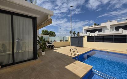 Bienvenido a esta magnífica propiedad pareada en la prestigiosa zona de Villa Alegría, San Pedro del Pinatar. Con una superficie construida de 125 m² y útil de 96 m², este hogar seminuevo combina elegancia y modernidad. La orientación Este-Oeste permite disfrutar tanto del sol matutino como de agradables brisas vespertinas desde su acogedora terraza. Esta lujosa vivienda cuenta con tres habitaciones exquisitamente decoradas: dos amplias para máximo confort y una adicional ideal para invitados o como estudio versátil; además, dispone de tres baños completos con acabados premium que realzan el estilo contemporáneo del inmueble. En el exterior te espera un oasis privado donde podrás relajarte junto a tu piscina rodeada por exuberantes áreas verdes que garantizan privacidad total e intimidad absoluta. A tan solo 800 metros encontrarás hermosas playas cristalinas mientras disfrutas también las comodidades únicas que ofrece el barrio: accesos inmediatos a transporte público, centros comerciales selectos y colegios reconocidos en la regióncercana perfectaspara familias activas! Sin olvidar vistas inmejorables hacia zonas montañosas ideales para pasear al aire libre o jugar en espacios infantiles cercanos.